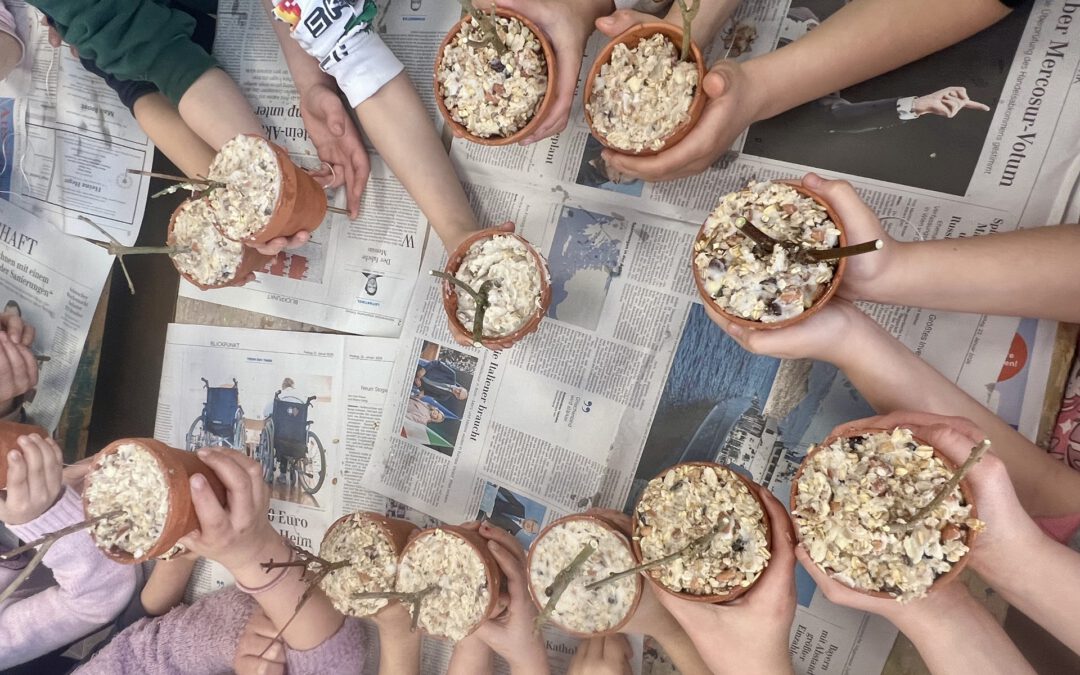 Die 2. Klasse der Grundschule Osterwald bastelte voller Energie mit dem NABU Stadtverband Garbsen-Seelze Futterglocken, um den Meisen, Spechten, dem Rotkehlchen, der Amsel und anderen Gartenvögeln durch den Winter zu helfen.