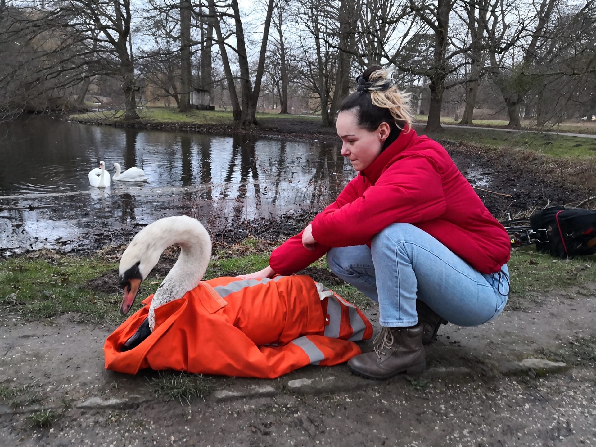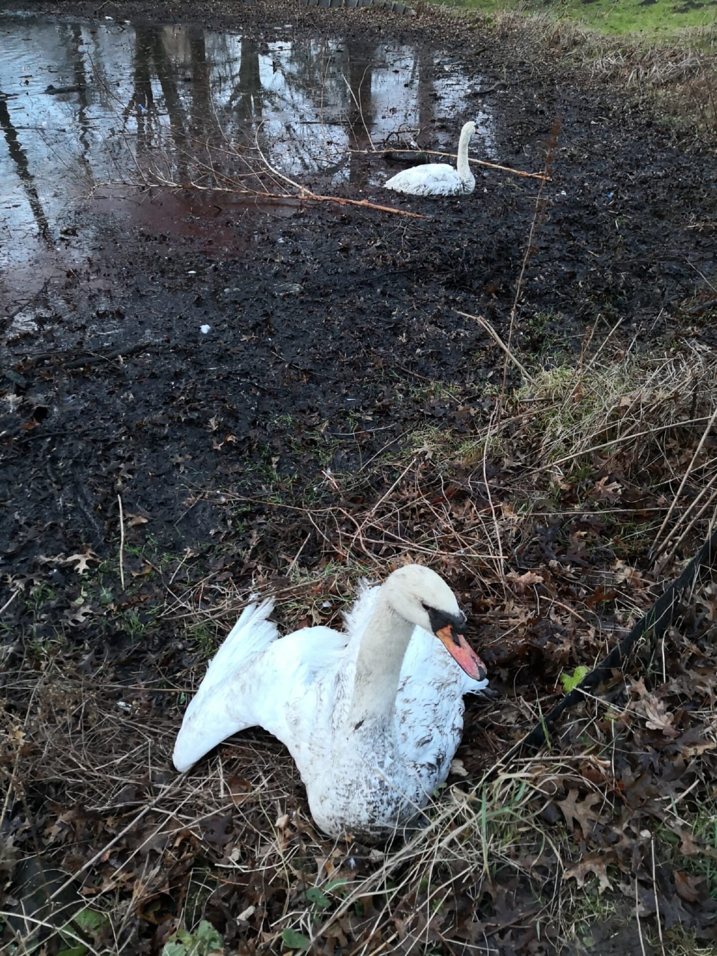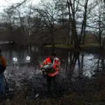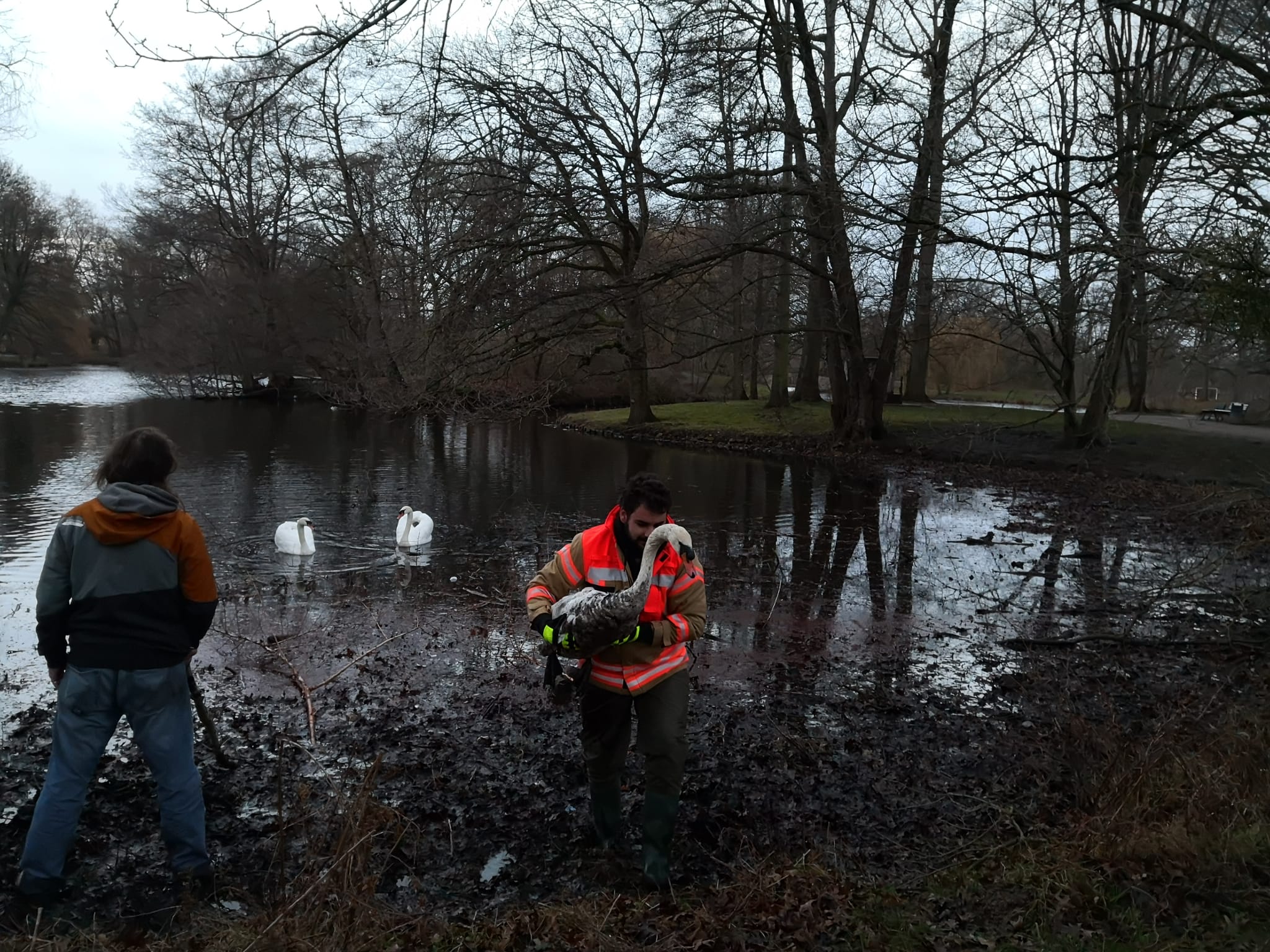 „Es war eine anstrengende und sehr matschige Rettungsaktion“, schmunzelte Jerome Böhm von der Tierrettung vom NABU Stadtverband Garbsen. Dabei ging es um die Rettung von zwei Schwänen aus dem Morast eines Gewässers. Ohne den Einsatz des Teams von Jerome wären die beiden Schwäne vor Ort verendet. Denn als die Retter am Gewässer eintrafen, waren die Schwäne bereits vollkommen ermattet. Nach Einschätzung der Lage stieg Jerome gut ausgerüstet mit der Wathose beherzt in den Morast und barg fachkundig die beiden Tiere. Am Ufer erwartete ihn Kim und wickelte die Tiere in eine wärmende Jacke. Vollkommen verdreckt aber glücklich konnte das Team die Tiere in Sicherheit bringen. „Einige Tage werden die Schwäne nun versorgt, um sie dann in einem anderen Gewässer wieder auszuwildern.